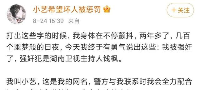 8月24日,网曝知名主持人钱枫涉嫌强奸,引发舆论哗然。