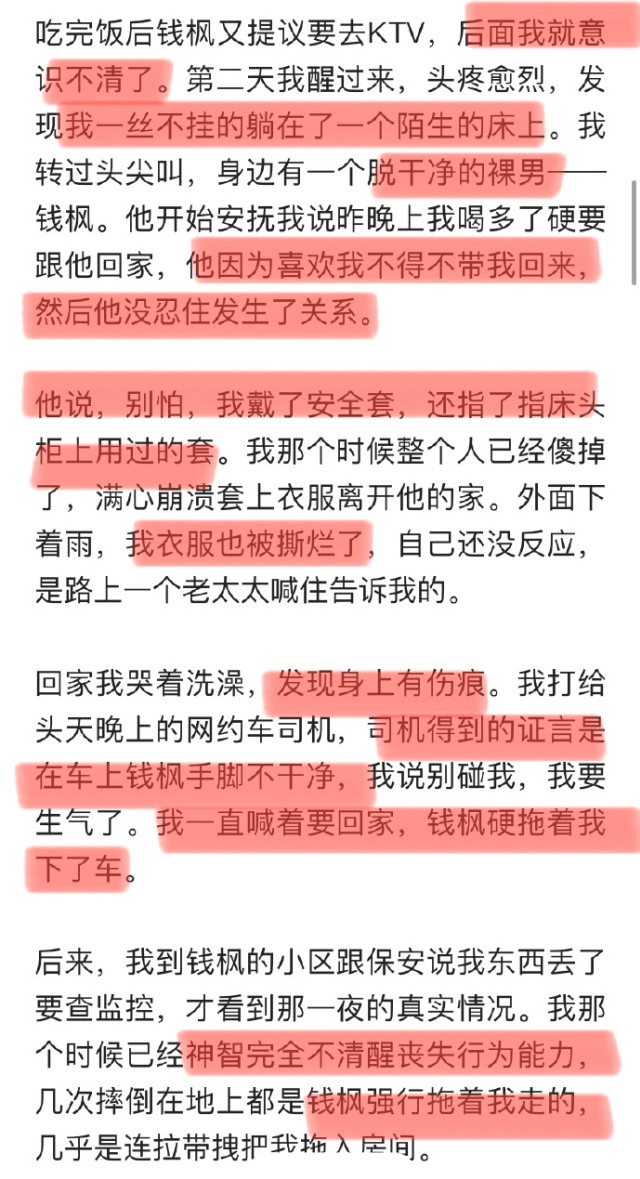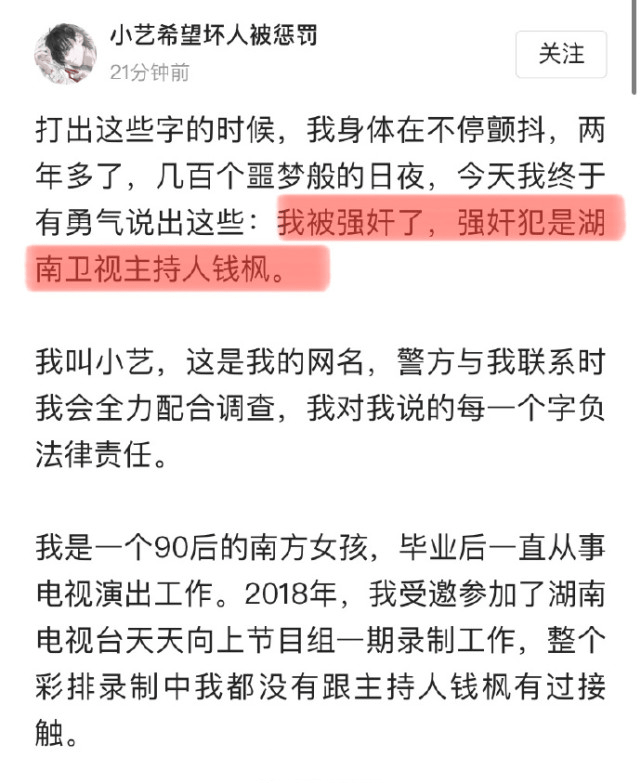 8月24日,女网友“小艺希望坏人被惩罚”发文举报钱枫性侵,并晒出相关聊天记录和监控视频证明。
