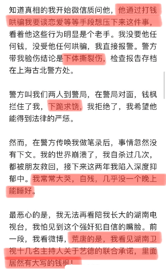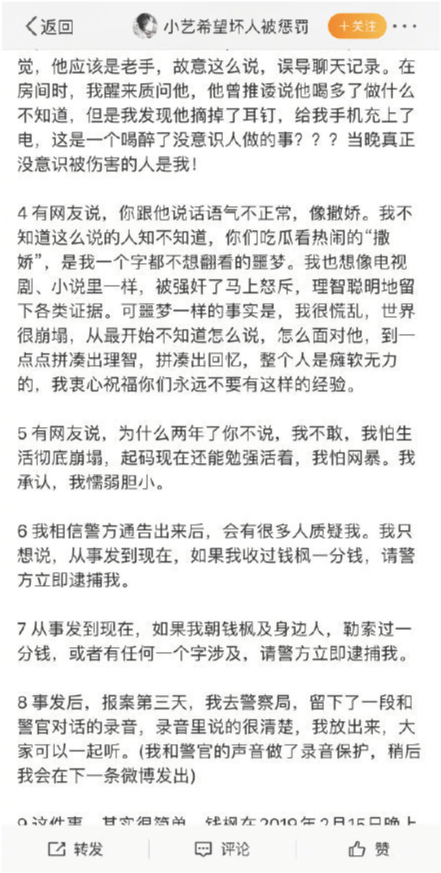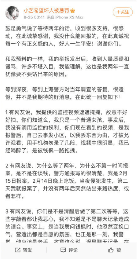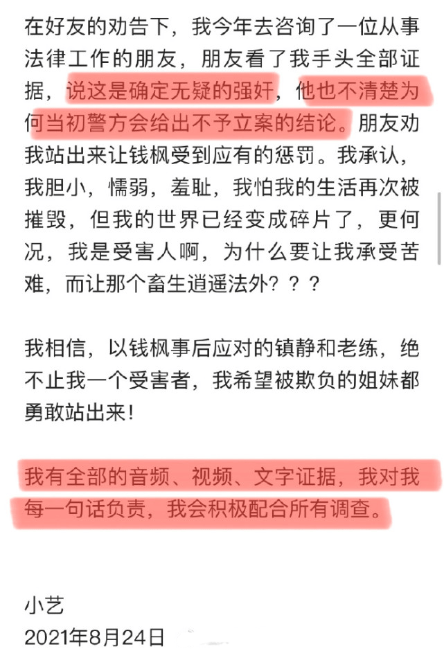 警方通报公布后,小艺也发文做了回应,表示钱枫曾在调解室当面承认强奸,自己会整理证据提供给警方。