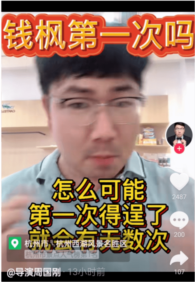 8月25日,青年导演周国刚发视频谈钱枫被举报性侵的事情。视频中,面对网友“钱枫是第一次作案吗”的疑问,周国刚直接说道:“怎么可能?第一次得逞了就会有无数次,就跟吴亦凡一样”。