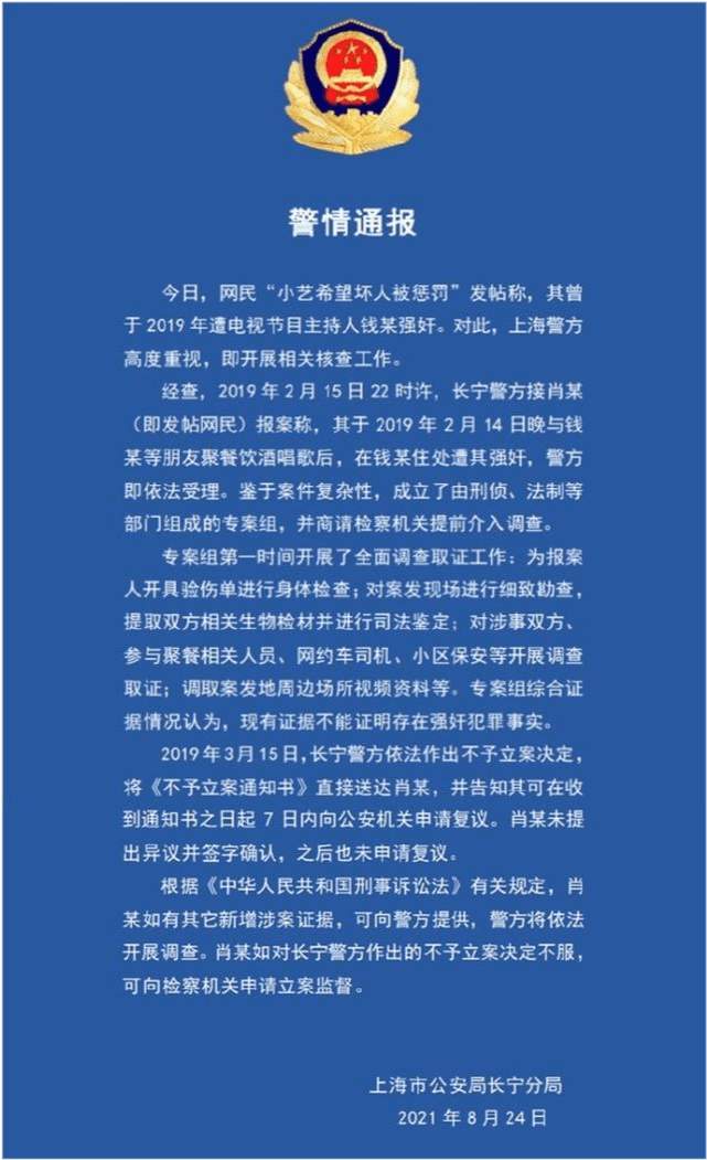 而且在通报最后,长宁警方还表示如果小艺有新增涉案证据,可向警方提供,警方会依法调查。