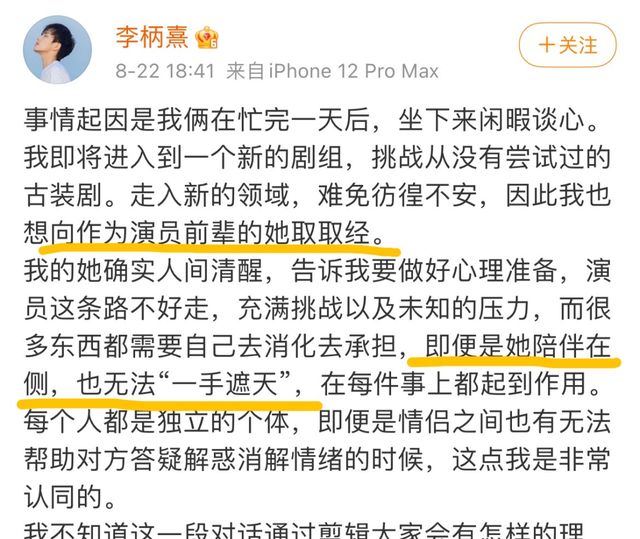 面对这些质疑声,李柄熹先是发微博解释,自己即将挑战古装剧,有些彷徨不安,于是找张雨绮取经,缓解下情绪。