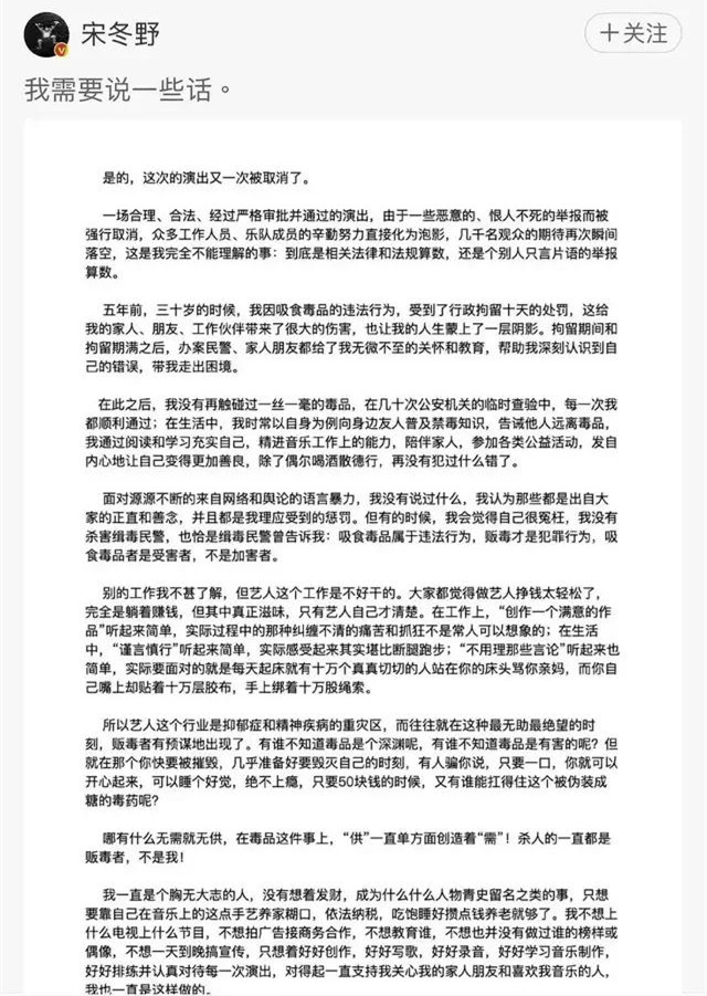 而宋冬野一段长文想表达的也很简单,之所以发长文是因为自己的演出被取消了,被取消的原因不是审批没通过,而是被一些人举报。宋冬野虽然知道为什么而举报,但他认为自己有很多的冤屈,认为自己虽然犯了错误,但这五年来积极改过自新,并没有犯错。
