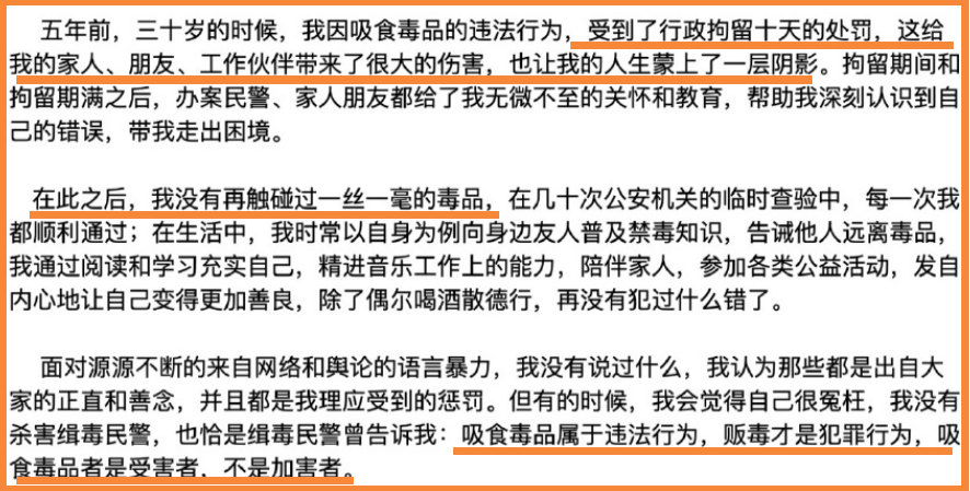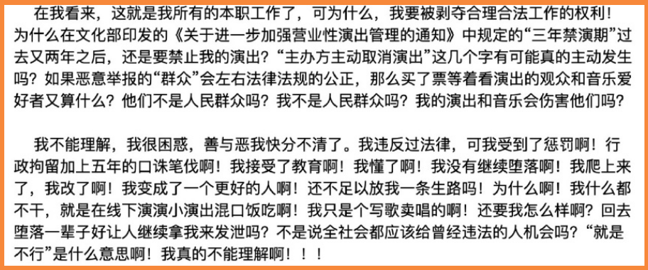 虽然内容很长很长,但关键点只有一个:我是吸毒了,但我已经过了禁演时限,为什么还要无故禁止我的演出!为什么不能放我一条生路?