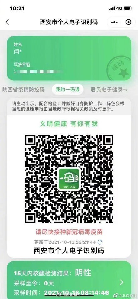 姜先生提供的其妻子闫女士西安市个人电子识别码显示,10月16日其在西安进行采样,15天内核酸检测结果为阴性