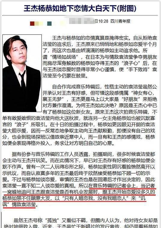 2000年,杨恭如与王杰发生了一段露水情缘,但差点又陷入“三角恋”。