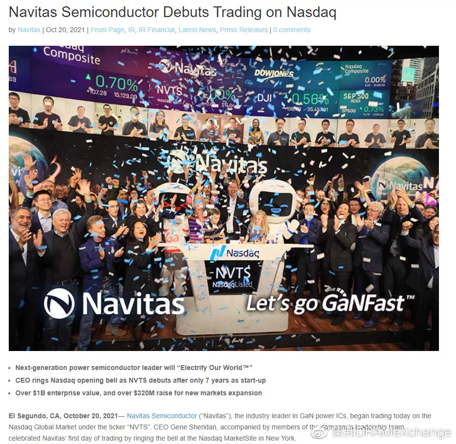 美东时间10月20日,GaN功率半导体厂商Navitas Semiconductor(“纳微半导体”)成功在纳斯达克全球市场交易,股票代码为“NVTS”。有媒体报道称,纳微半导体的市值已超16亿美元(16.17亿美元)。