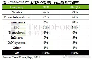 集邦咨询预计,2021年,纳微半导体将以29%的出货量市占率超越Power Integrations(PI),拿下今年全球GaN功率市场第一名。