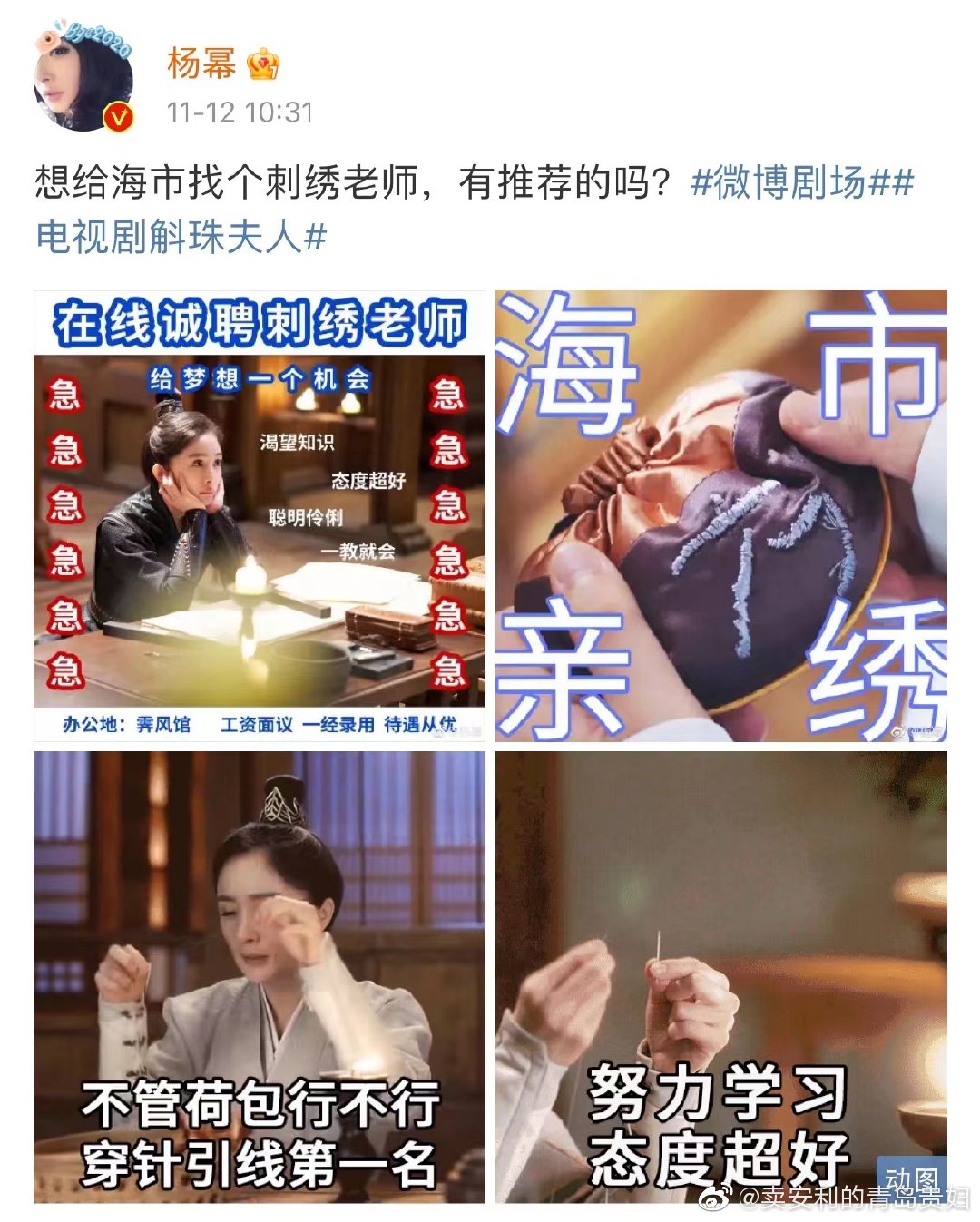 电视剧《斛珠夫人》昨晚更新,不知道大家有没有去看啊~~不过我们杨幂老师可是在线追剧,并强烈表示希望能给我们海市快找一个刺绣老师吧!哈哈哈哈哈哈,所以大幂幂也觉得海市在荷包上绣的方字不太行是吗[笑cry][笑cry]