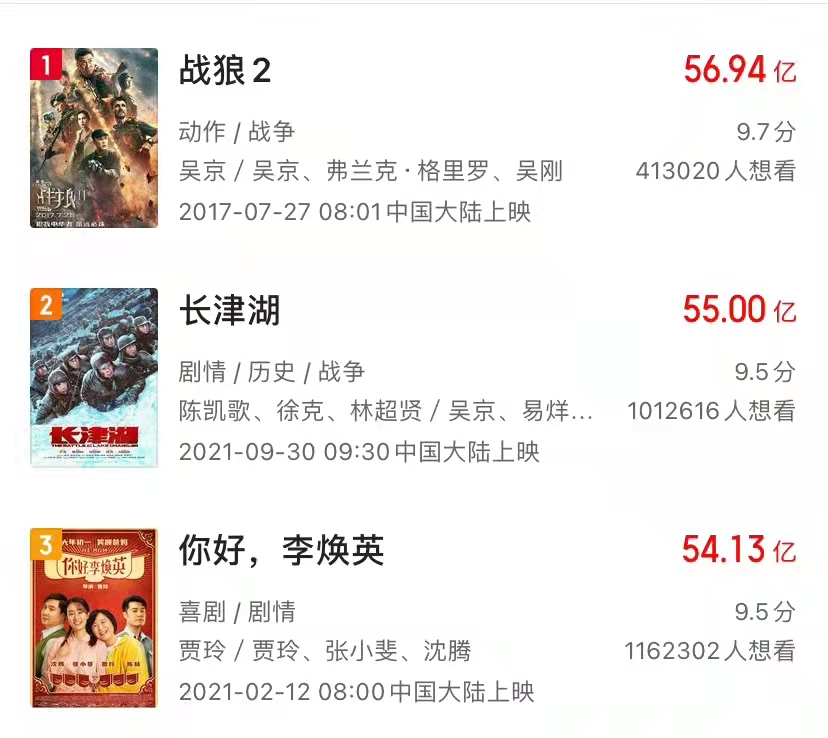 早在10月29日,《长津湖》票房已经凭借8.28亿美金,超过电影《你好,李焕英》,上升至2021全球票房榜首。