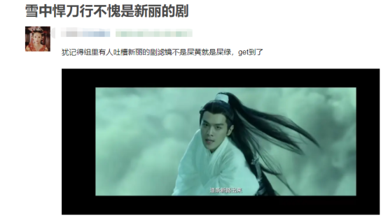 也有网友看完之后抓出了重点:新丽剧。新丽常年出品影视剧,早已坐稳滤镜界“杀手”的宝座,由新丽出品的剧,不管是人还是景,统一表现如下:要么发绿,要么发黄,要么漆黑一片。