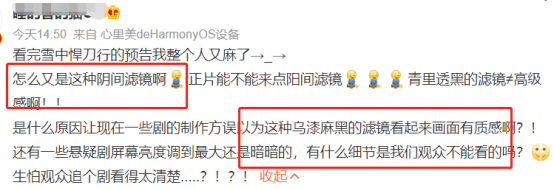 明明不是没有优秀参考案例,但滤镜还是越来越极端,也不明白他们是想让人看剧,还是不想让人看剧,所以还是请制作方醒醒吧,用点正常点的滤镜!