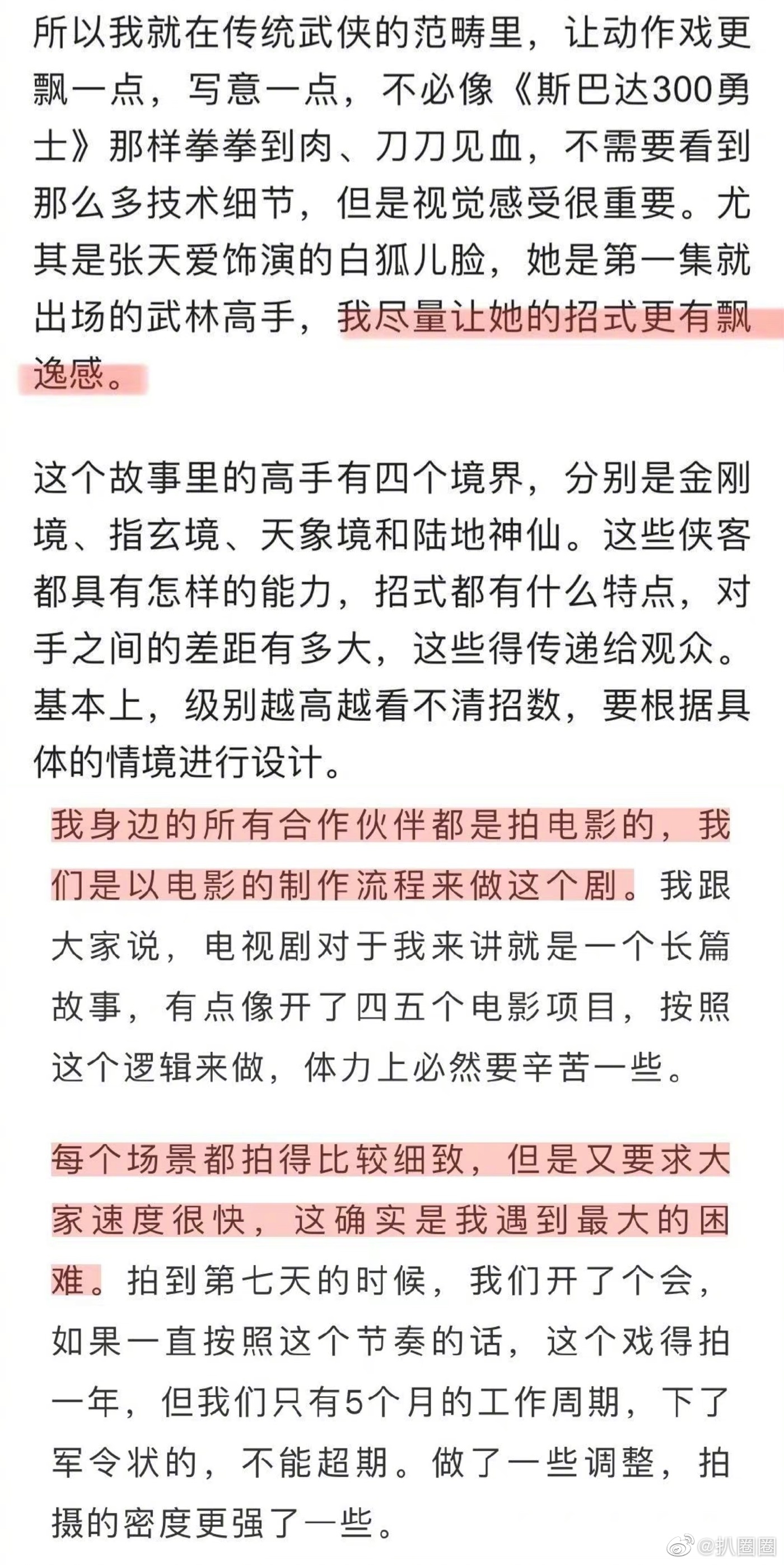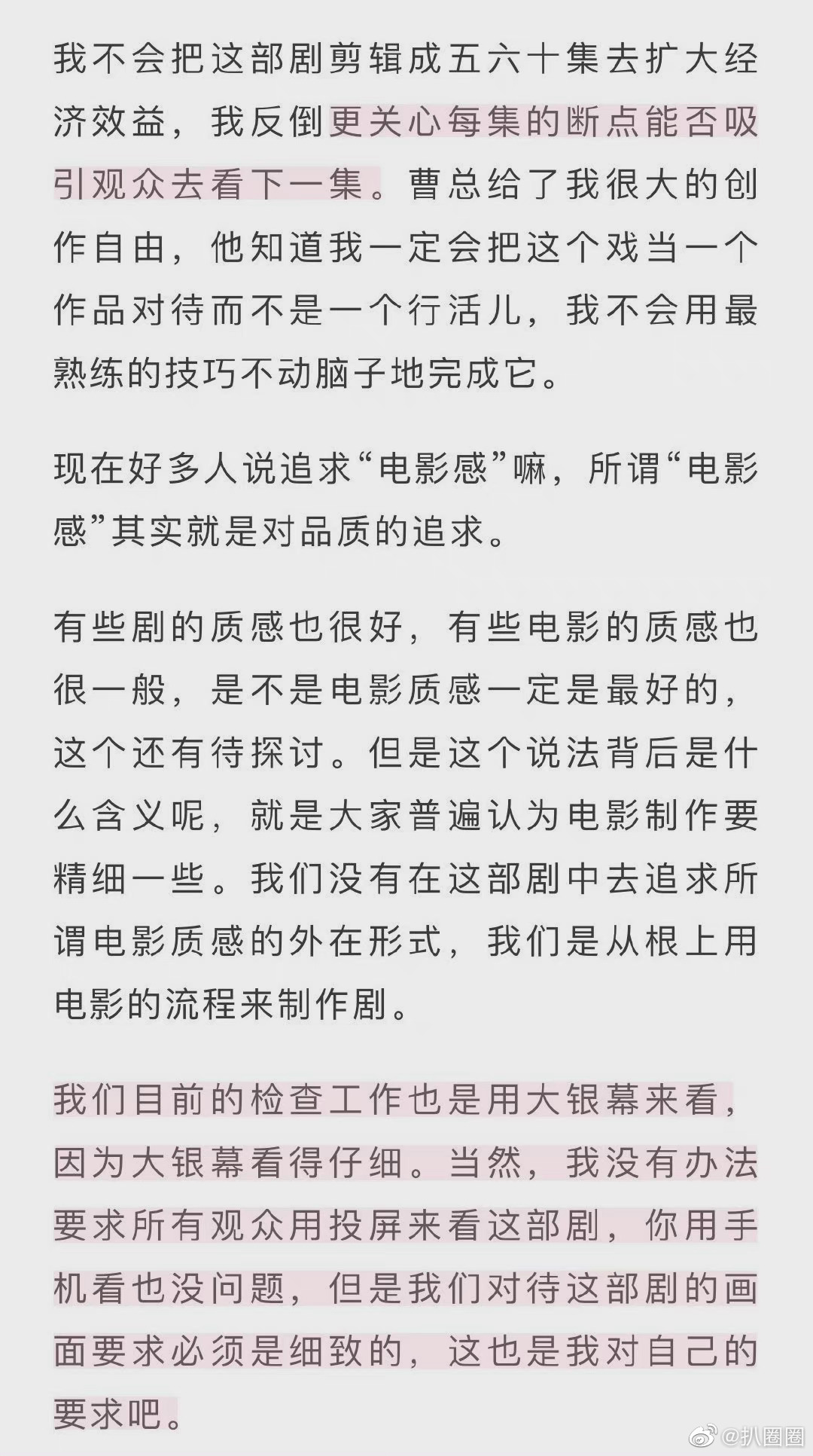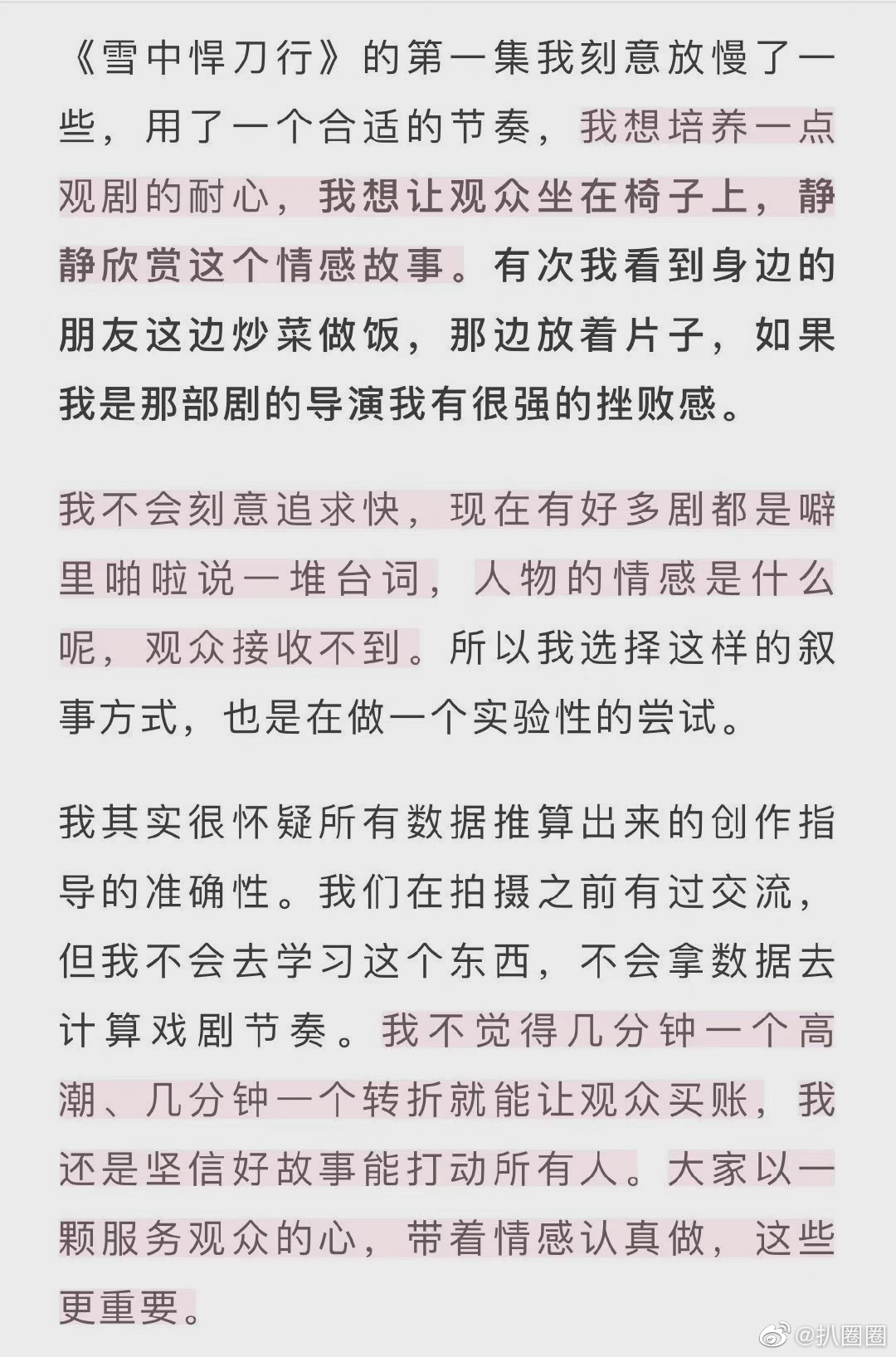 发表自话题: 雪中悍刀行的导演发文回应了打戏节奏慢和滤镜质感等引发的争议 :“我想培养一点观剧的耐心,不会刻意追求快。我不觉得几分钟一个高潮一个转折就能让观众买账,更关心每集的断点能否吸引观众去看下一集。我们检查工作也是用大银幕来看,观众用手机看也没问题,但我们对待这剧的画面要求必须是细致的。”~[吃瓜] 标签组:[娱乐八卦] [影视] 上一篇:张若昀头发都变绿了,《雪中悍刀行》别开护眼模式 下一篇:红星观察|国产剧“十级美颜滤镜”为何盛行?倪大红眼袋都滤没了