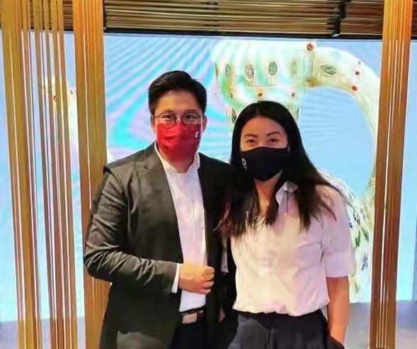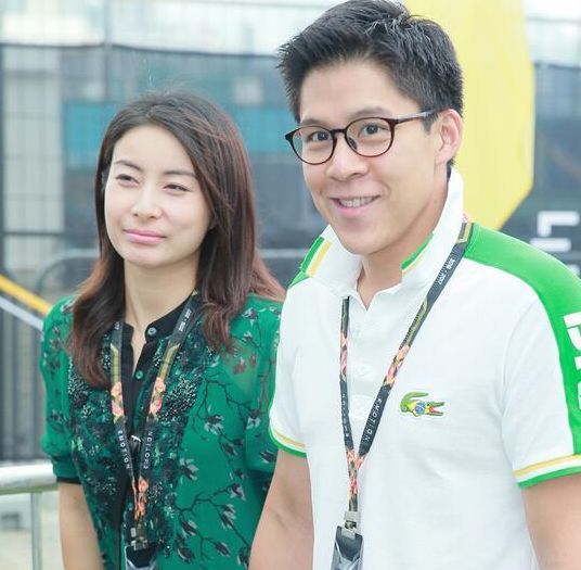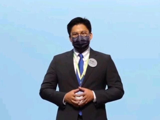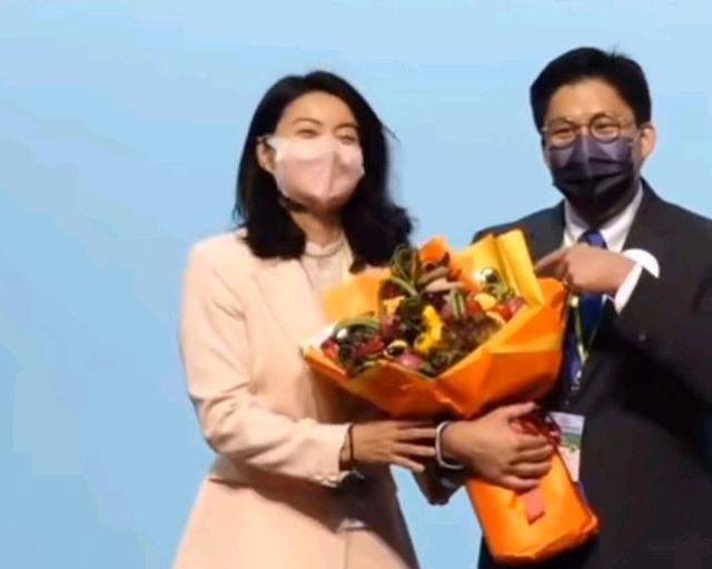 霍启刚上台演讲,穿着得体大方,他的妻子郭晶晶献花。