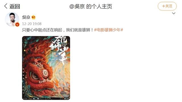 《雄狮少年》上映前后,网络上各种大V和明星纷纷推荐该片,观众最熟悉的明星当然是吴京,这位国内电影市场的扛把子在自己的社交平台上发布了一则很短的推荐文字,引来很多点赞和转发。