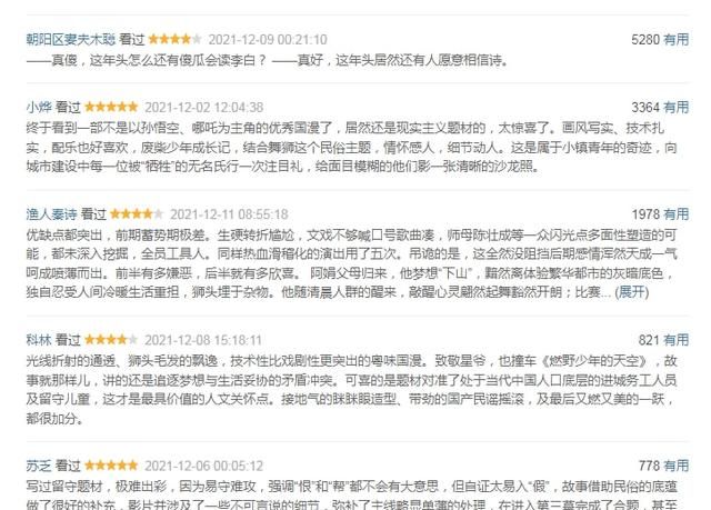 在《雄狮少年》的影评区,几乎绝大部分影评都给予该片四星和五星的高赞。看来,《雄狮少年》的“观众们”确实非常热爱这部电影,让人为之感动。