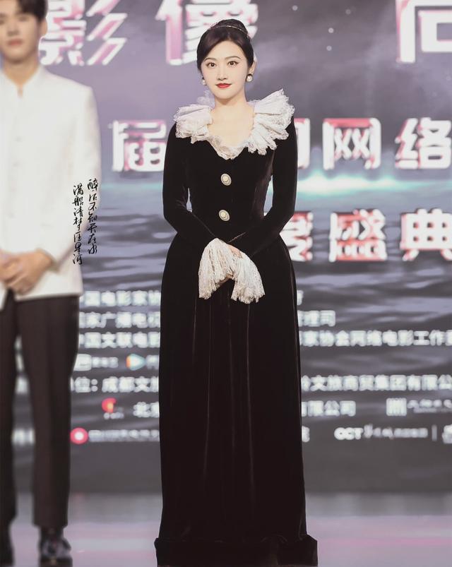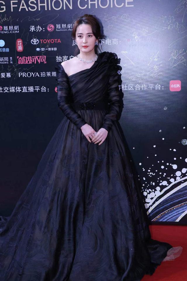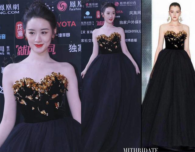 再来看看年轻妹妹的造型。袁冰妍的公主裙虽然是黑色,但却很有层次,立体的金色,丝绒的上衣搭配蓬松的黑纱,神秘但不无聊,发型搭配也非常清爽。但是爱心小耳环和这件大气的裙子不搭,丸子头其实也可以换成更精致的盘发~