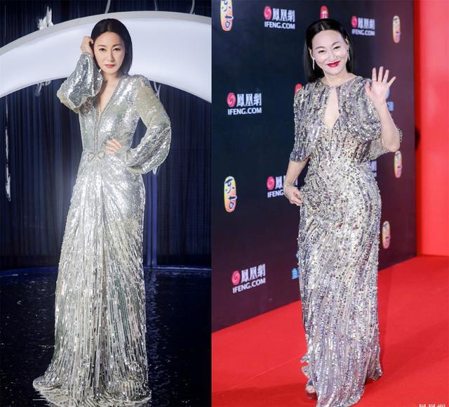 参加年底这样的盛典,自带派对氛围的亮片元素是最好用的元素之一,闪亮隆重,惠英红的银色亮片裙搭配披肩优雅端庄,搭配上红唇精神满满,近期几场红毯她独宠亮片裙哇~