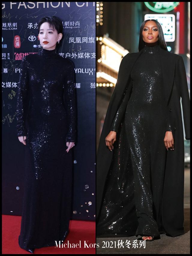 李斯丹妮的高领长袖礼服也同样保暖,但也有一定的难度,紧身+亮片显胖显膨胀。虽然日常是中性风,但李斯的身材管理可没落下。