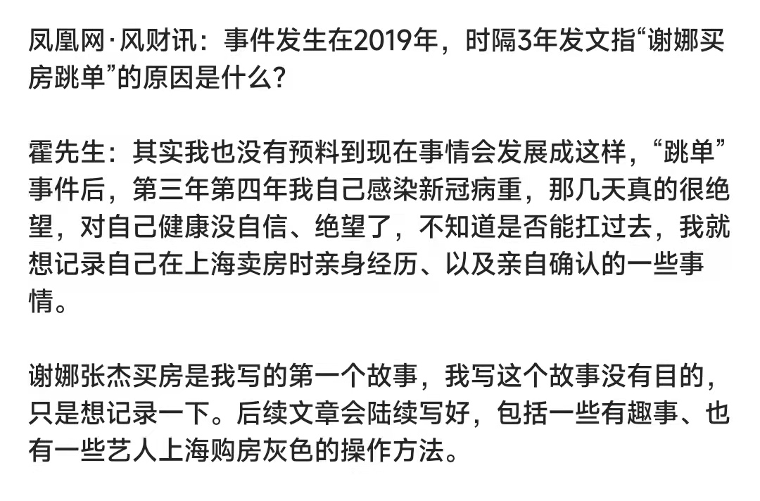 对于为什么在三年后才“爆料”,小哥说自己也没想到事情会这样发展,自己是在感染病毒以后,觉得对生活绝望,不知道能不能扛过去,才打算公布一些自己亲身经历的故事,谢娜和张杰只是开始,自己也会陆续发布一些其他艺人在买房方面的“灰色操作”。