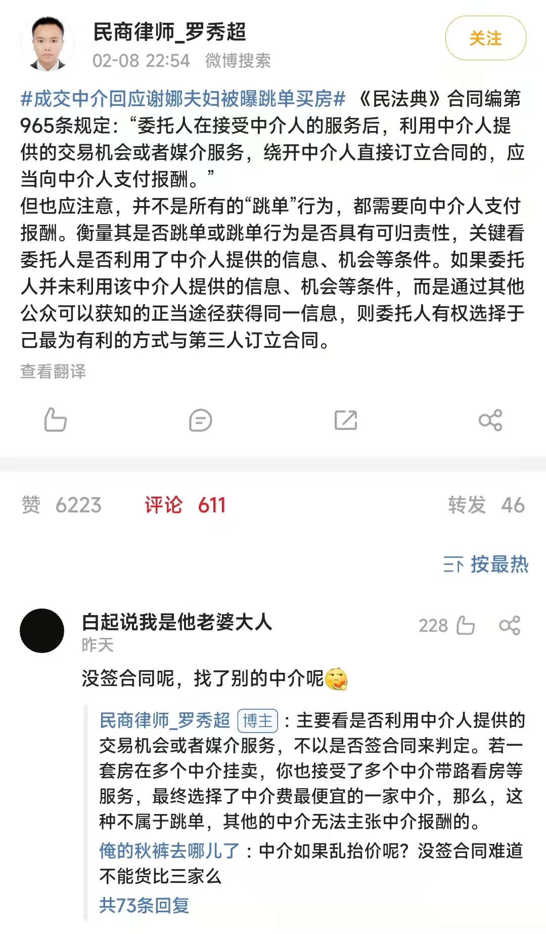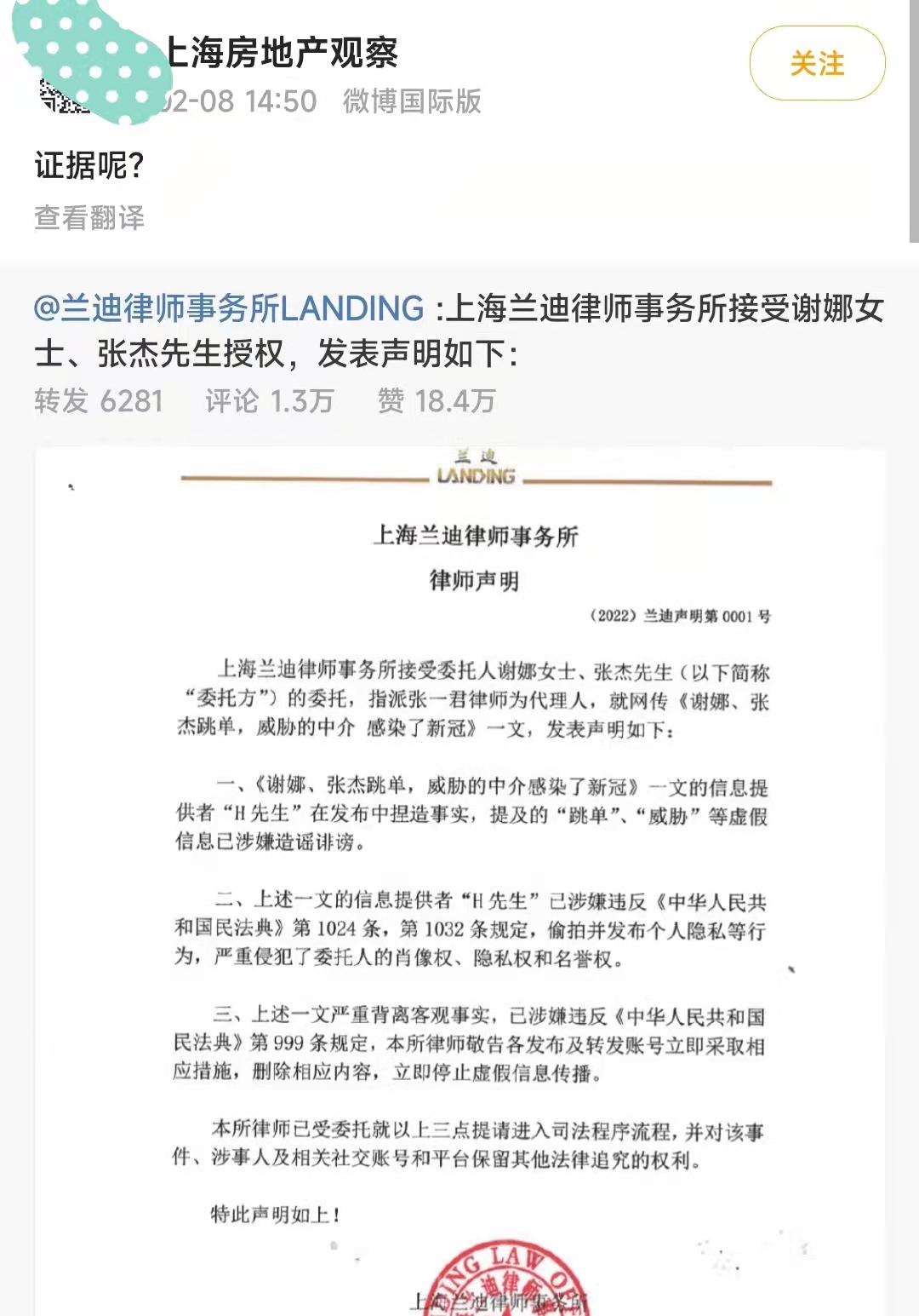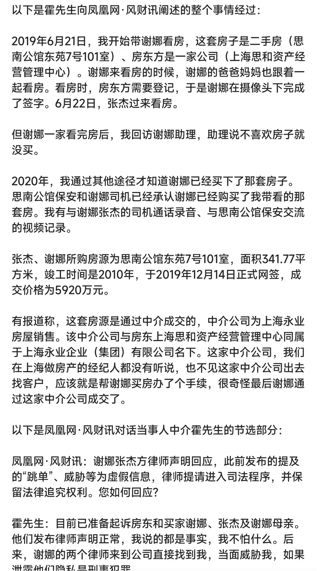而作为爆料者的卖房中介霍先生,更是直接转发了谢娜和张杰的律师声明进行回应,堂而皇之地索要证据,说谢娜和张杰就是直接和卖家进行了交易,不存在其他中介为谢娜和张杰争取更低价格或者更好服务的情况。