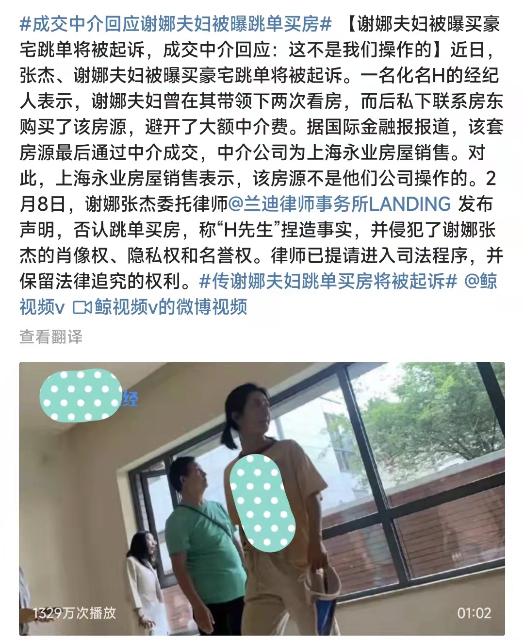 但中介小哥却通过其他途径了解到谢娜已经买下了这座豪宅,这事情也经过了谢娜的司机和助理确认,这点上中介小哥手里有证据。