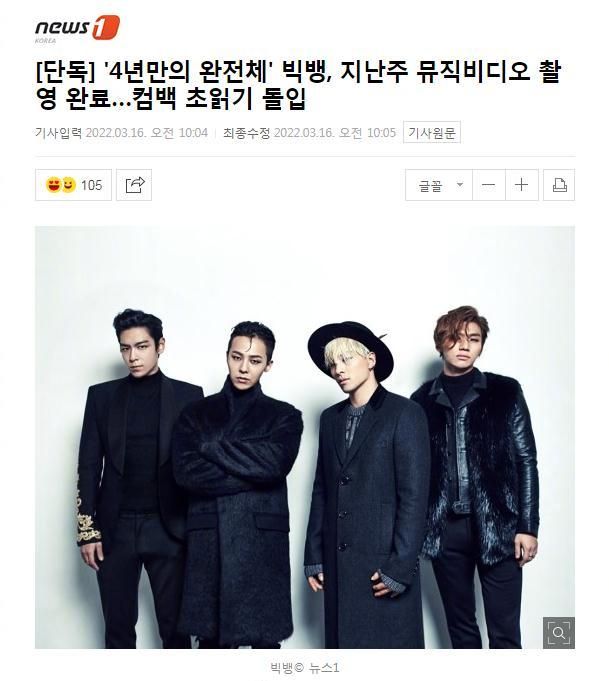 韩媒称上周BIGBANG完成了回归MV的拍摄。