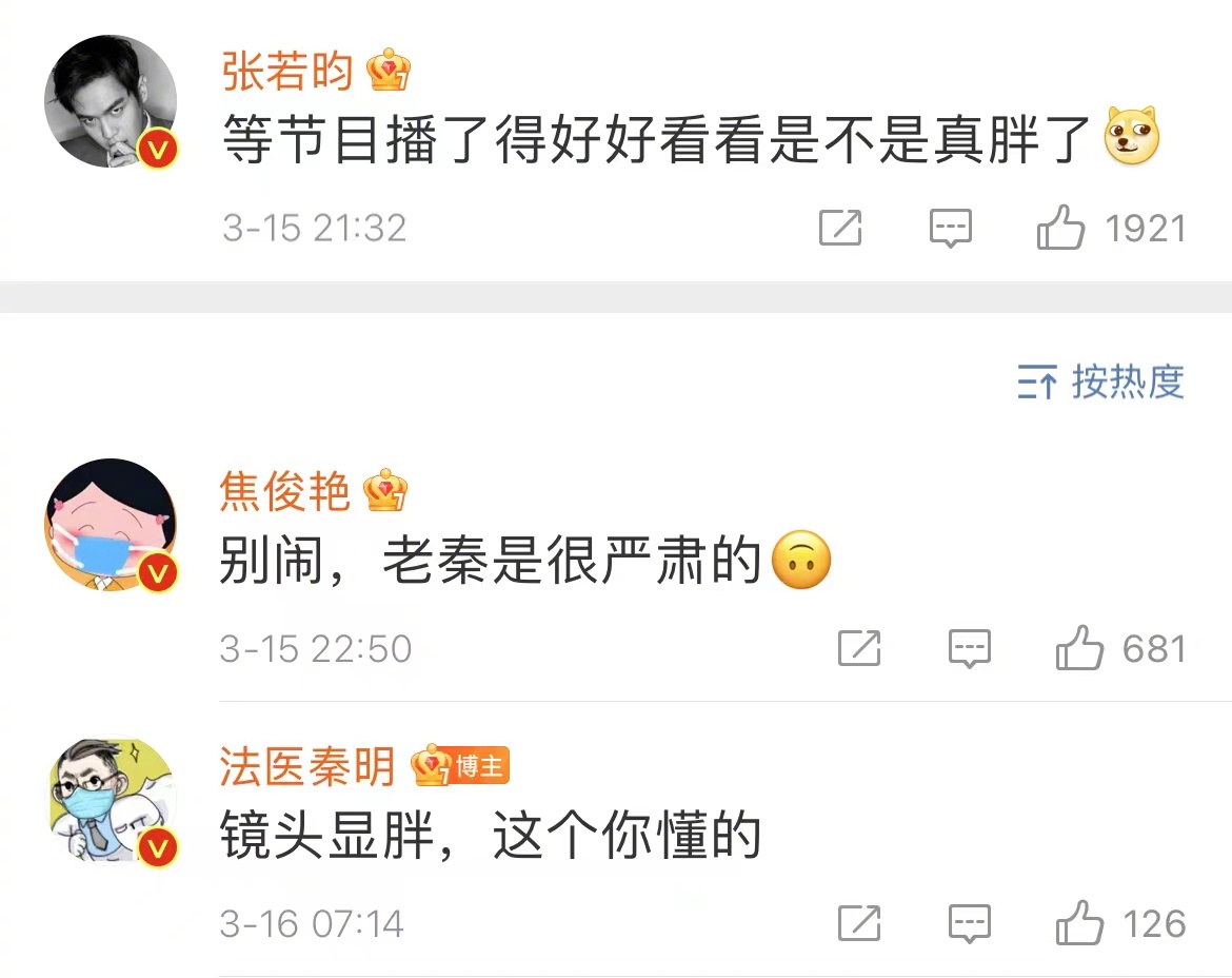 评论区中更是有张若昀和焦俊艳的有爱互动!