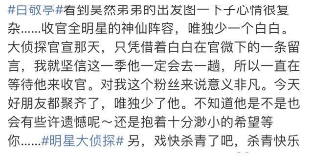 同样遗憾的还有白敬亭,王鸥好歹还回来露了面,但白敬亭由于拍戏的原因,压根没有参与前期录制,就连尚未播出的几期也没有看到他的名字。本来大批观众还期待着白敬亭能回来参加个收官,但按照这个阵容看,白敬亭大概率也是缺席一整季,无缘回归了。