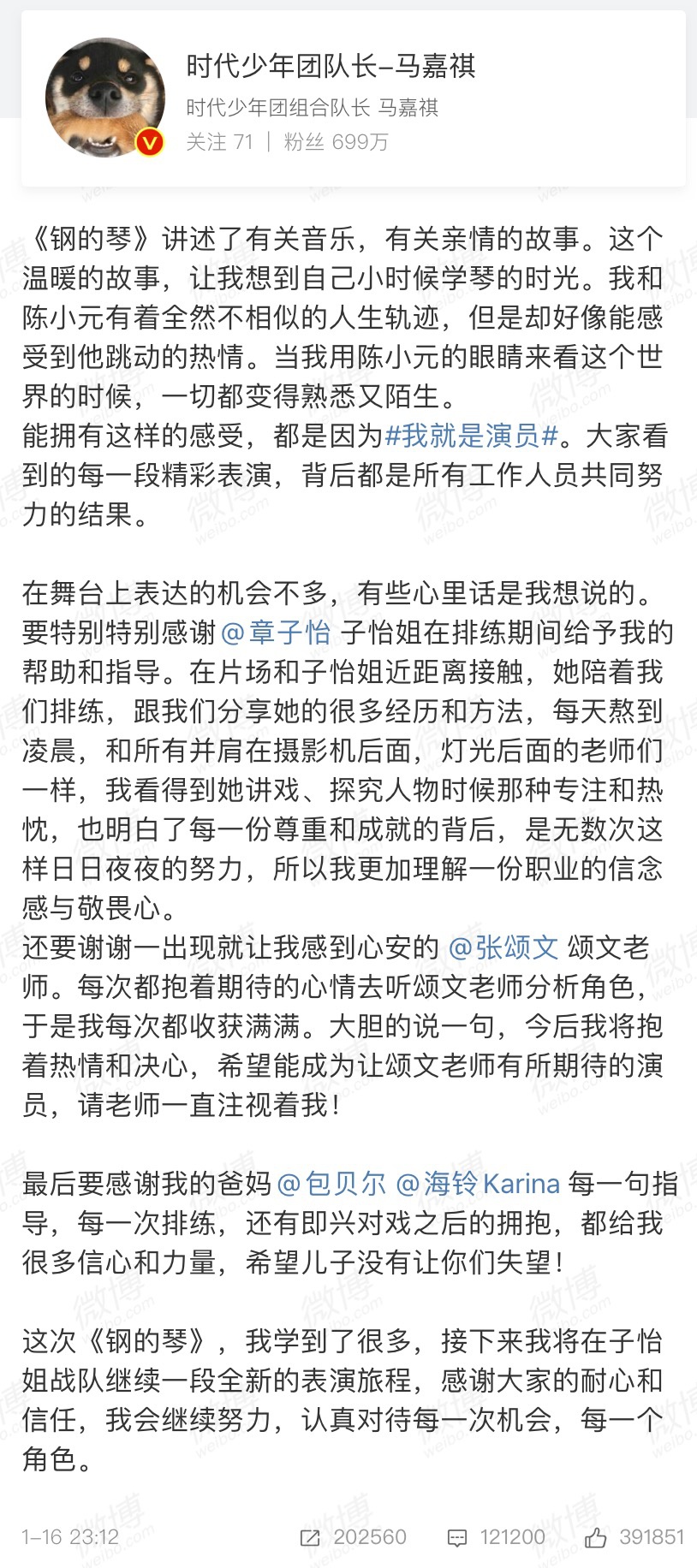 马嘉祺节目播出后也发表了长文,表示感谢章子怡和张颂文,还有合作演员包贝尔和海铃,其实这段戏为什么能够成功,离不开老师们的细心指导,还有马嘉祺在节目中也表示,自己和父亲很少见面,和包贝尔的对戏让他有种和父亲在对话的感觉,让他入戏很快,看来马嘉祺还是观察能力很强,能够将现实生活的感受带到表演中,其实这就是演员的真听真看真感觉的表现。