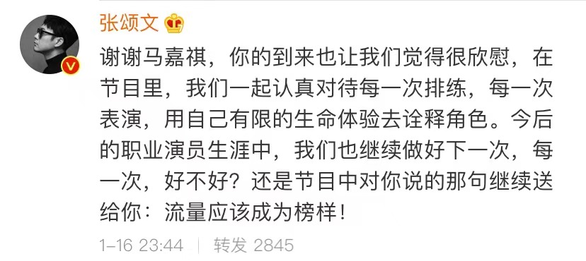 两位指导老师都回复了马嘉祺的感谢,都认为流量可以成为榜样,章子怡回复马嘉祺,感谢他的努力和信任,希望下一个角色更精彩,一起加油。