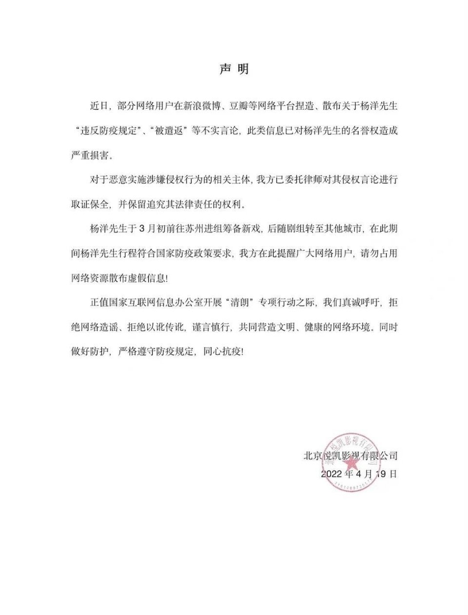 发表自话题:杨洋方声明 #杨洋工作室发声明#杨洋工作室发表声明,对杨洋先生名誉权造成严重损害,恶意侵权的,取证保全,追究法律责任,支持[good] 标签组:[鏉ㄦ磱] 上一篇:杨洋工作室发表声明,杨洋于3月初前往苏州进组筹备拍戏…… 下一篇:告!知法犯法,杨洋违反防疫规定被遣返?明星谣言为何越演越烈?